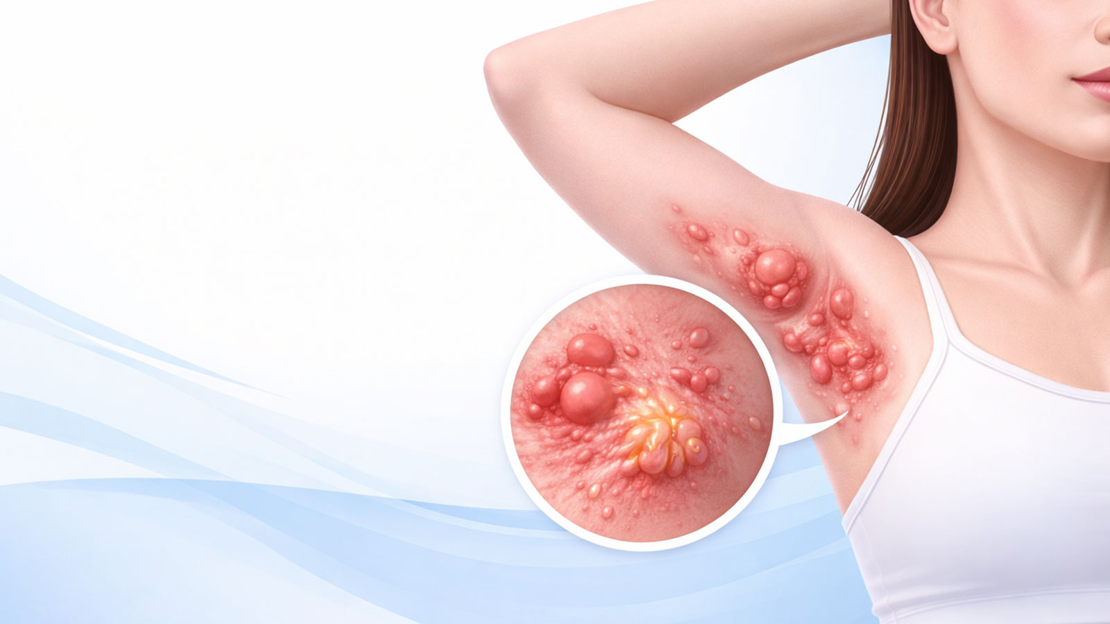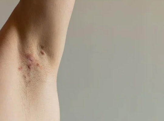 Hidradenitis Suppurativa (HS) is a chronic skin condition that causes painful lumps, boils, and abscesses under the skin. It commonly affects areas where skin rubs together, such as the underarms, groin, buttocks, and under the breasts. These lumps can become inflamed, may burst, and sometimes lead to scarring and tunnels under the skin (sinus tracts). HS is not contagious, but it can significantly impact quality of life if not treated early.
